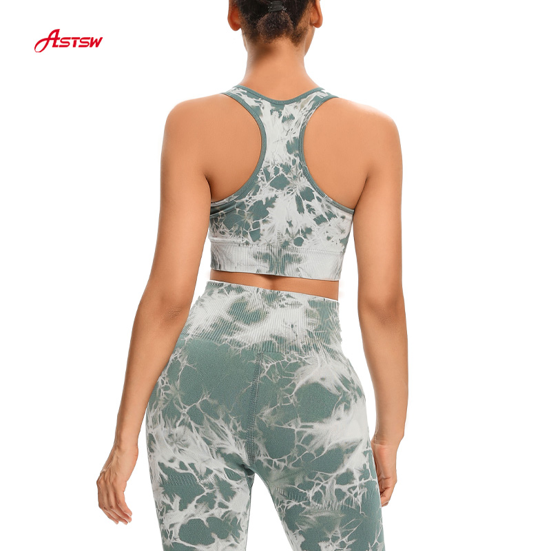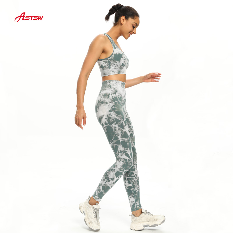 Nahtlose Sportbekleidungskollektion. Dieses nahtlose Racerback-BH-Oberteil und die hoch taillierte Yogahose mit Batikmuster.